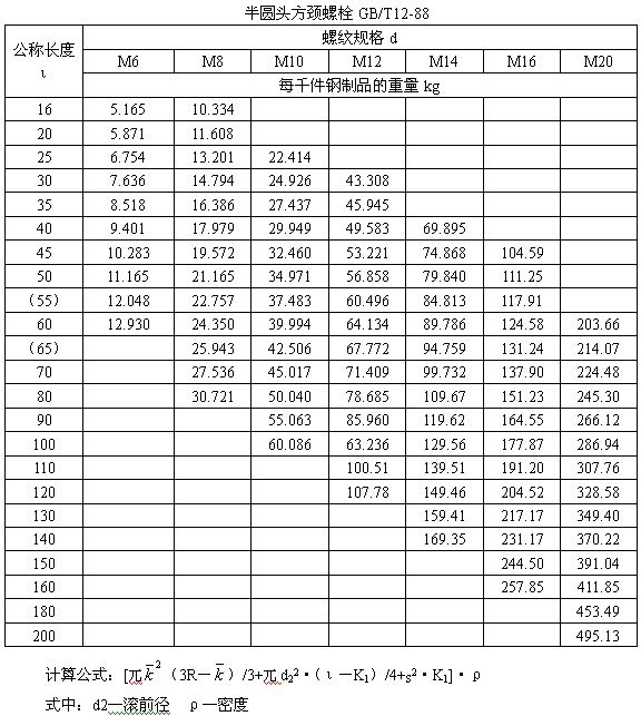 编者按86版紧固件有关国家标准不再含有紧固件重量部分,根据紧固件行业生产经营的需要,应部分紧固件厂商的要求,沈阳标准件研究所所长张金明结合多年从事紧固件生产技术的实验经验,对符合2004年底之前现行有效紧固件有关标准的产品重量,根据生产实际进行了理论重量公式推导,并且籍助于计算机功能较为准确的进行了理论重量计算。本刊自2005年第2期刊登以后,受到广大读者的好评。为了满足读者的要求,本刊将继续刊载供大家参考使用。